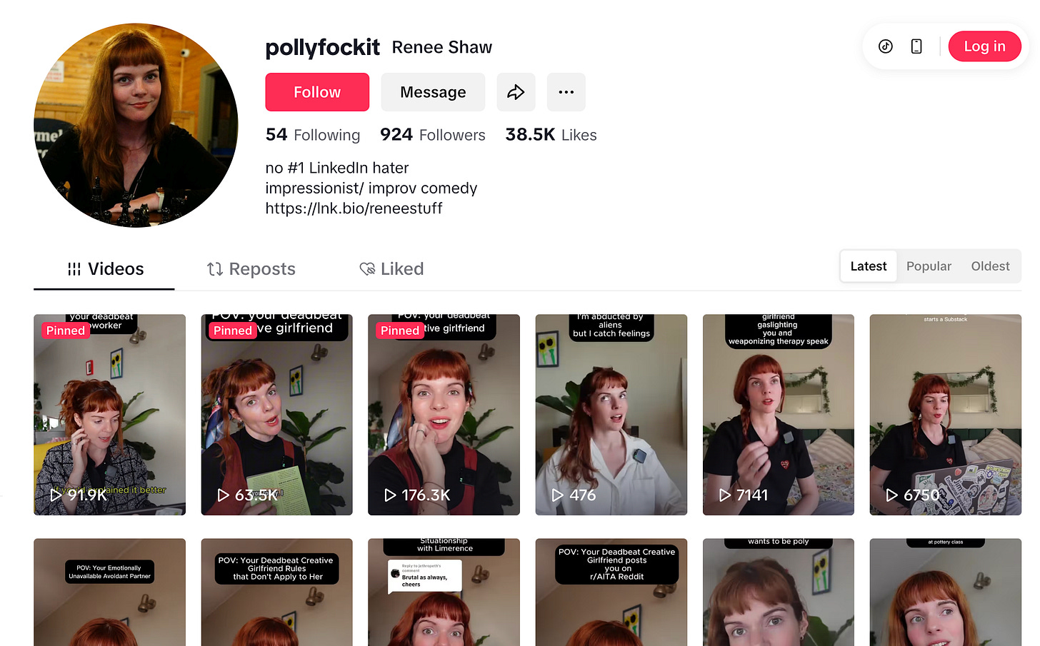 my vids on there are character improv. mostly “creative deadbeat girlfriend” and “avoidant partner” skits.